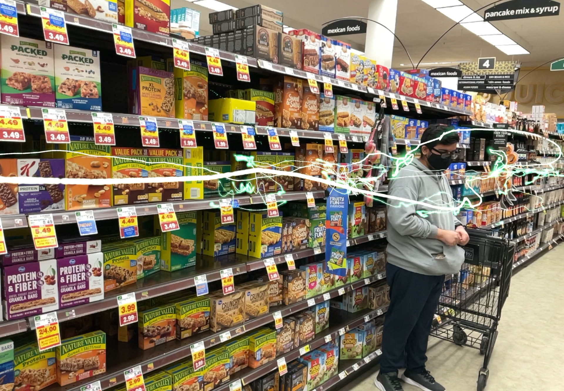 At the height of the Covid-19 pandemic, quarantine restrictions were lifted allowing my college roommates and I to go grocery shopping. Utilizing a drawing app on my iPad I tracked my movement to-and-from the store with a virtual line. Amidst global fear and isolation, the work showcases a need for human connection through playful, fun, and safe disruption of space.